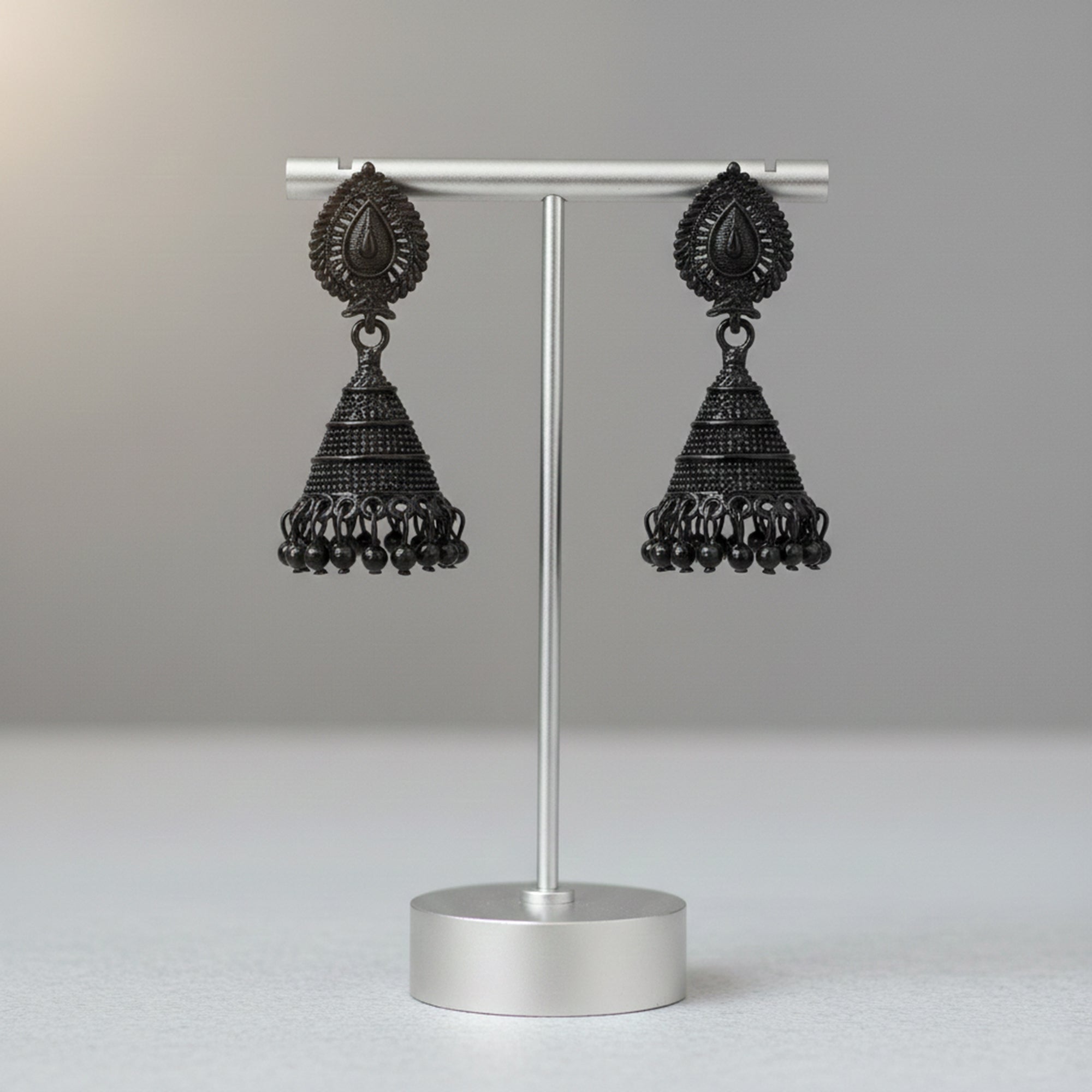 Crafted in deep black oxidised metal, these earrings feature a beautifully detailed leaf-shaped top that flows into a classic jhumka.